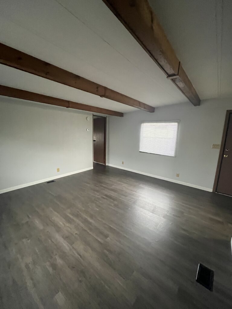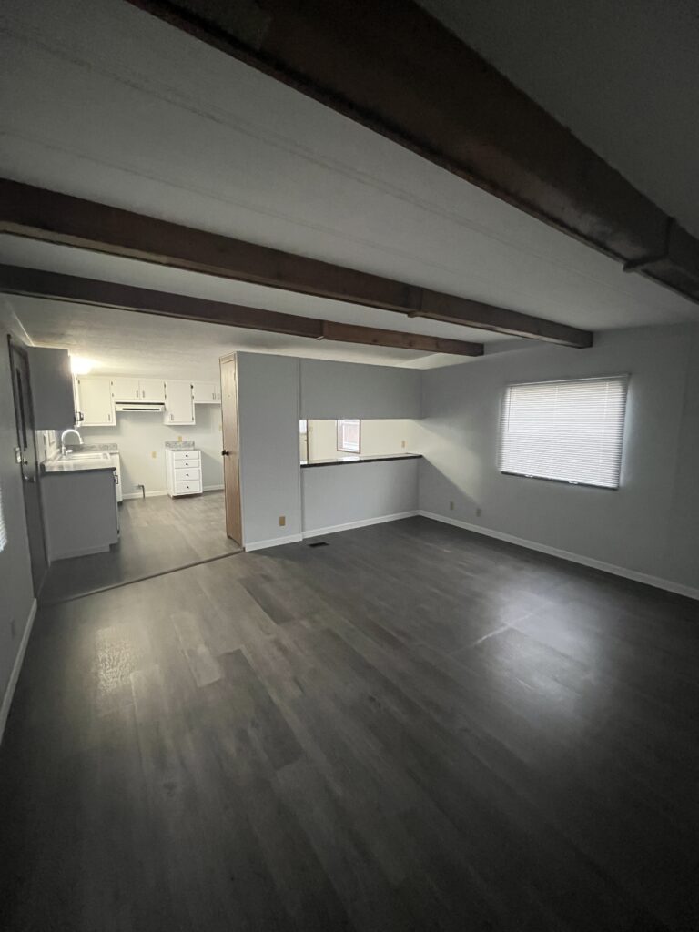 Are you ready to move into a beautiful, remodeled home? Enjoy the sunny, open concept bringing together the living room and kitchen. The living room boasts large windows and a wood beam vaulted ceiling. The master bedroom has convenient, direct access to the bathroom. There is generous storage throughout including numerous cabinets in the kitchen and laundry room, a pantry in the kitchen, large closets in both bedrooms with built in drawers and a linen closet in the bathroom.